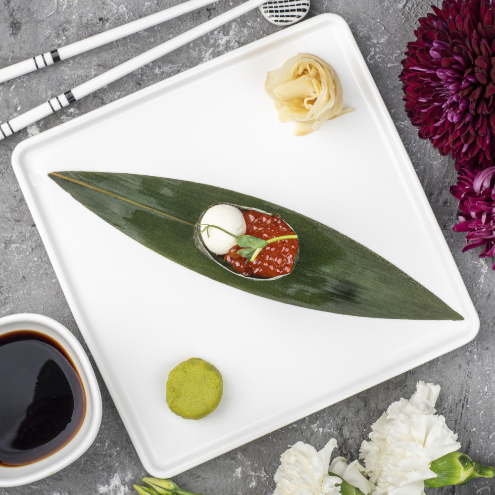 Рис, червона ікра, крем-сир, мікрогрін, норі.