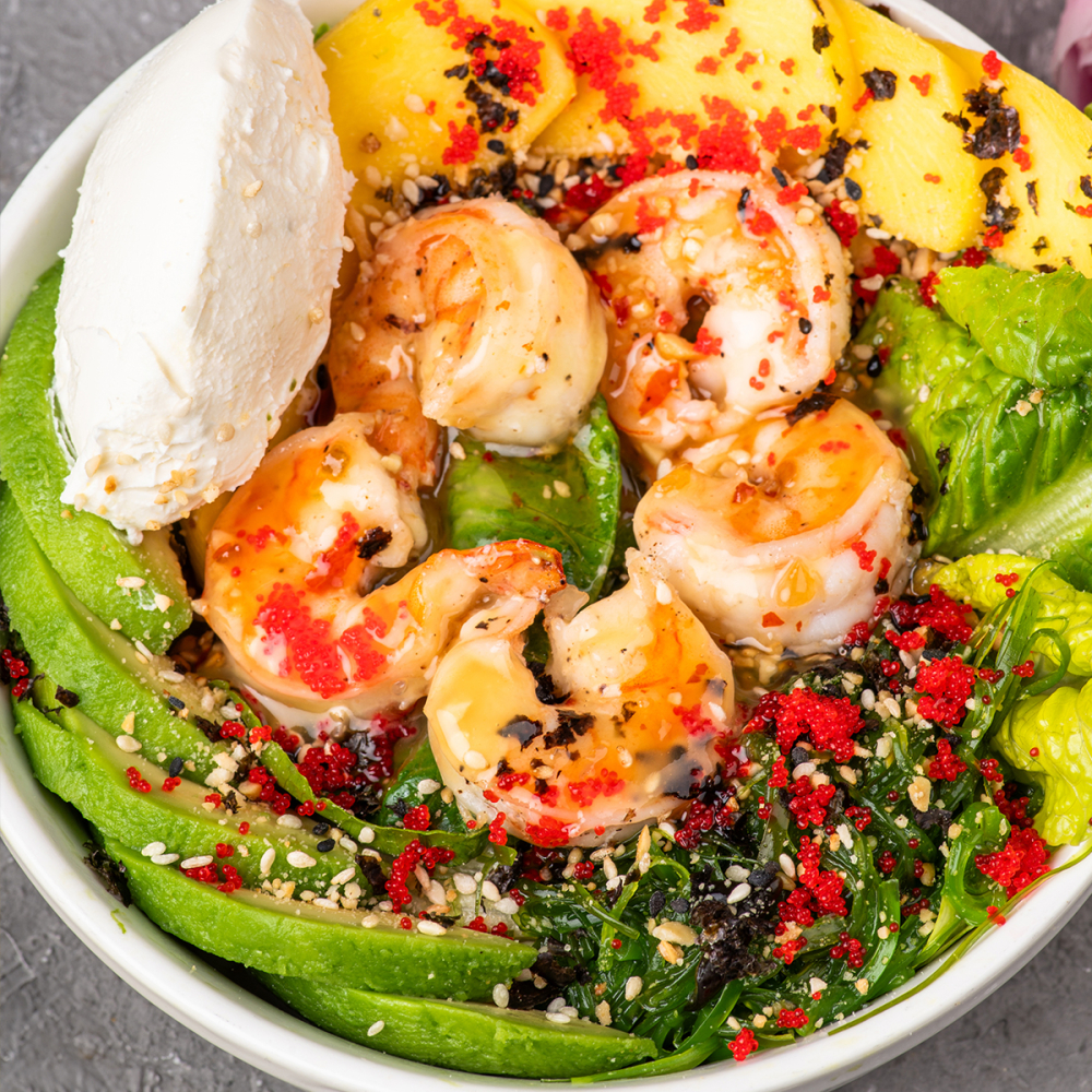 - Рис, креветка смажена, манго, авокадо, чука, мікс салату, крем-сир, соус вінігрет, соус світ чилі, ікра тобіко червона, кешʼю, кунжутна олія, кунжут суміш, пил норі.Калорийность 662,2Білки: 22Жири: 37,3Вуглеводи: 98,4Вага: 430Алергени: Кунжутна олія, соя, лактоза, кеш'ю.