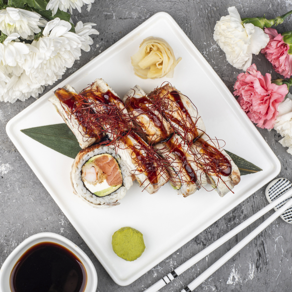 - Рис, лосось, вугор, авокадо, креветка панко, крем-сир, соус унагі, соус світ чилі, нитки чилі, норі.Калорийность: 858,9 ккалБілки: 54,1 гЖири: 49 гВуглеводи: 132,9 гВага: 480 гАлергени: Молоко, соя.*Вугор може містити дрібні кісточки.