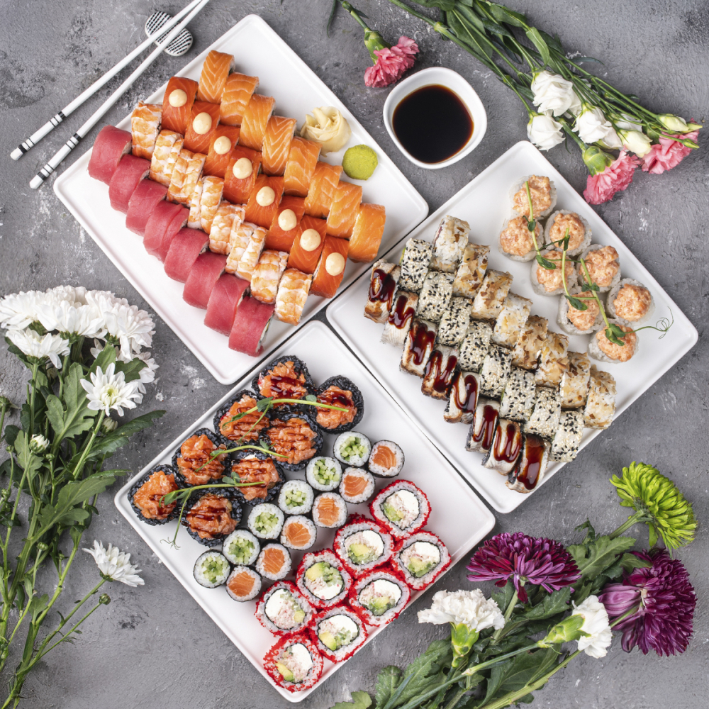 - Філадельфія з лососем, Філадельфія з креветкою, Рол зі слабососленим лососем та чорним рисом, Гострий лосось і манго, Рол з тунцем у стружці, крем-сиром і огірками, Дракон з вугром і чорним рисом, Каліфорнія з лососем, Філадельфія з тунцем, Макі з лососем, Макі з огірком, Філадельфія з копченим лососем, Каліфорнія з cніжним крабом.Калорийность: 5310,4 ккалБілки: 280,2 гЖири: 226,2 гВуглеводи: 700 гВага: 3650 гАлергени: Молоко, соя, яйця, кунжут, манго, груша.